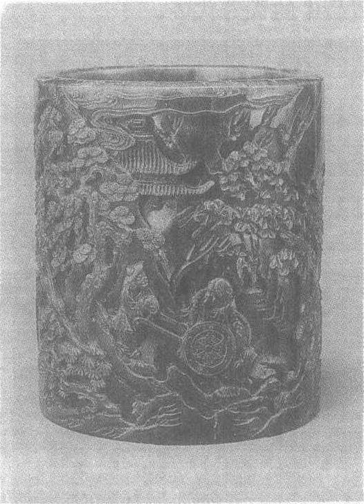 释义 | 山水人物图玉笔筒清。高18厘米。台北故宫博物院藏。笔筒呈圆柱形,上下垂直,圆唇折沿,以一块碧玉琢制。玉色深沉,周身无一点瑕疵,十分难得。笔筒外壁雕刻近景山水一幅,山石浑劲,古木苍翠,弯曲的石径隐约可见,重檐方亭弥漫在云雾之中。一位戴斗笠穿短衣的汉子推一两轮小车,上坐一身着长袍的人,其神态悠然自得。笔筒的雕刻风格质朴刚劲。口沿上有清高宗的御题诗。 |
