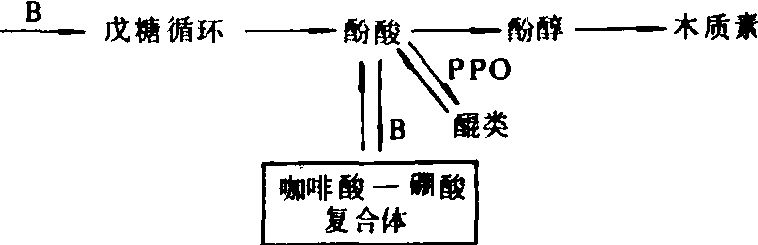 硼的生理功能 硼与糖或糖醇络合形成硼酯,这是硼一切生理功能的基础。硼与糖形成的化合物有下列几种: 由于硼酸和二相邻羟基的比例以及基质pH值的不同而生成不同的硼酯类化合物。这些硼化合物可能参与一系列代谢进程(图)。形成硼酯复合体需要具有相邻顺式二元醇构型的多羟基化合物,包括多种糖类及其衍生物(如糖醇和糖醛酸),特别是甘露醇、甘露聚糖以及甘露糖醛酸。相反,葡萄糖、果糖以及半乳糖及其衍生物(如蔗糖)不具备这种顺式二元醇构型,因此不能形成稳定的硼酸复合体。一些磷二酚,如咖啡酸和阿魏酸,它们是双子叶植物木质素生物合成的前体,具有顺式二元醇构型,因此能形成稳定的硼酸复合物。 硼对植物影响的可能途径和顺序 高等植物的总硼量有很大部分是以顺式硼酸酯形式络合在细胞壁中。双子叶植物需硼量高于单子叶植物,这是与细胞壁,主要是半纤维素和木质素前体中具有顺式二元醇构型的化合物比例高有关。单子叶植物如小麦的细胞壁中牢固结合态硼的含量为3~5微克/克干重,而双子叶植物如向日葵中则高达30微克/克干重。这种差异反映了不同植物种之间硼的需要量不同。 细胞伸长和组织分化 缺硼的最显著的反应就是主根和侧根的伸长受抑制,使根系呈短粗丛枝状。植物缺硼,根内IAA氧化酶的活性迅速提高,根伸长减慢。 已发现生长素(IAA)和硼之间有明显的相互作用。绿色植物中,IAA只有在维管植物中形成,它参与木质部导管的分化,因此,一般对硼的需求也仅限于维管植物。缺硼对组织分化的影响是典型的。缺硼导致根伸长减慢,茎形成层组织细胞分裂加强,形成层细胞增生,以及木质部分化削弱。缺硼植株中,生长素水平比正常植株高得多。外源IAA诱发的根尖解剖学变化与缺硼时相似,这曾使人们认为,植物的缺硼症状是生长素水平增高的一种反映,然而缺硼和IAA水平过高所引起的根尖结构变化并不相同。在比较不同的植物种类或植物器官时并未发现IAA水平和缺硼症状间有明显关系。只有那些对缺硼有反应而积累某些酚类的植物,其IAA才会提高。因为这些酚类化合物是IAA氧化酶活性的有效抑制剂。某些酚化合物不仅是根伸长的有效抑制剂,而且能同时促进细胞径向分裂。其诱发的形态学变化与IAA引起的变化相似。 酚代谢和木质素形成 缺硼将导致植物体内酚类化合物积累。酚类化合物积聚能抑制IAA氧化酶的活性。在正常植株中,硼能与酚类化合物络合,克服酚类化合物对IAA氧化酶的抑制作用。在木质素形成和木质部导管分化过程中,硼对羟基化酶和酚类化合物酶的活性起控制作用。植物缺硼导致酚类化合物和IAA代谢的改变,植物组织受损伤,与植物受微生物侵入受损的情况相同。因此缺硼组织的代谢变化和细胞的破坏,很可能是缺硼组织本身的酚类化合物累积造成的。硼在调节酚代谢和木质化作用方面的功能可以概括如下: 硼似乎不仅调节底物转向戊糖—磷酸循环,而且还通过形成稳定的酚酸,特别是咖啡酸—硼酸复合体来调节木质素的生物合成。因此,缺硼时有酚类积累,这会促进多酚氧化酶(PPO)的活性,导致细胞壁中高活性的中间物如咖啡醌的浓度增高。 碳水化合物运输和蛋白质代谢 硼在碳水化合物代谢中的功能主要集中在两方面:细胞壁物质的合成和糖的运输均与硼有关。硼能促进葡萄糖-1-磷酸的循环和糖的转化。在缺硼的植物根中,标记磷(32P)结合进入核苷酸受阻,而己糖磷酸盐积累。因此,利用碳水化合物合成纤维素或RNA的反应也会在由己糖磷酸盐形成核苷酸的阶段受阻。缺硼使细胞壁的形成受阻。硼不仅和细胞壁成分紧密结合,而且是细胞壁结构完整性所必需。它与钙共同起“细胞间胶结物”的作用。 植物缺硼时核酸含量下降,强烈地影响RNA合成。特别是尿嘧啶合成受到削弱。而尿嘧啶核苷酸是RNA的主要组分,也是高能磷酸盐的前体: 缺硼植株RNA含量下降,新叶蛋白质含量降低,而可溶性氮化合物,尤其是硝酸盐积累。蛋白质含量降低仅限于细胞质,而叶绿体蛋白质含量则不受影响。这一结果与缺硼时失绿现象并不普遍的事实是一致的。缺硼对叶子代谢和组成的影响是间接的,缺硼影响根的生长和细胞分裂素的合成和向地上部的输送,硼对烟草尼古丁生物碱有相同影响。 花粉萌发和花粉管生长 种子和谷粒生长所需的硼量往往比营养生长高。玉米和三叶草都是如此。硼对受精具有间接的和直接的双重影响。硼的间接作用可能与花蜜中糖量的增高及其组成的变化有关,使虫媒植物的花对昆虫更有吸引力。而硼的直接作用反映在供硼与花药的花粉产生能力以及花粉粒生活力之间的密切关系上。而且,硼能刺激花粉萌发,特别是花粉管伸长,油菜缺硼导致“花而不实”,主要是由于花粉萌发和花粉管伸长受抑制。 玉米花粉萌发和受精要求的含硼量至少为3微克/克干重,而柱头的缺硼临界水平更高。葡萄是需硼量很高的一种作物,当其柱头含硼量为8~20微克/克干重时授粉就减弱。1980年刘易斯(Lewis)的研究表明,以形成硼酸—胼胝质复合体使来自花粉管壁的胼胝质的生理活性钝化,要求在柱头和花柱中有高水平的硼。在硼水平低时,胼胝质量增加,并诱发植物防御素(包括酚类化合物)合成。形成一种与受到微生物侵染时所产生的相似的防御机制。 硼是种子和果实形成所必需。水稻缺硼每穗粒数减少,大麦缺