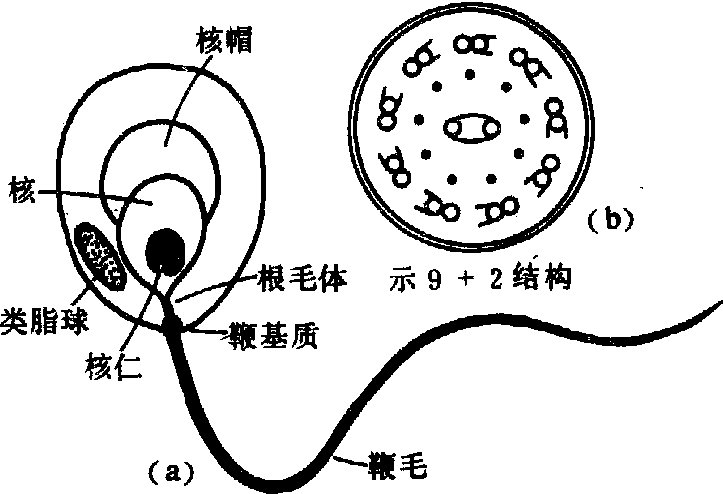 动体与细胞核之间有纤维状根丝体连接。与根丝体结构相同的条状小根,可延伸到细胞质中或核膜或其他细胞器中,如中心粒、第二动体或线粒体。单根微管是小根系统的一部分,将鞭毛固定于细胞结构上使活跃的鞭毛在运动时不会从细胞上脱落。在有的类型中,两个动体仅生出一个鞭毛,成为单鞭毛菌,因此有人认为单鞭毛菌起源于双鞭毛菌。鞭毛的形态、结构和数目在真菌的系统发育、亲缘关系和分类、演化上具有非常重要的意义。游动孢子除含有上述细胞器和内含物外,还含有线粒体、高尔基体、内质网、核糖体、核帽、脂肪滴、γ-粒、泡囊等(图2)。