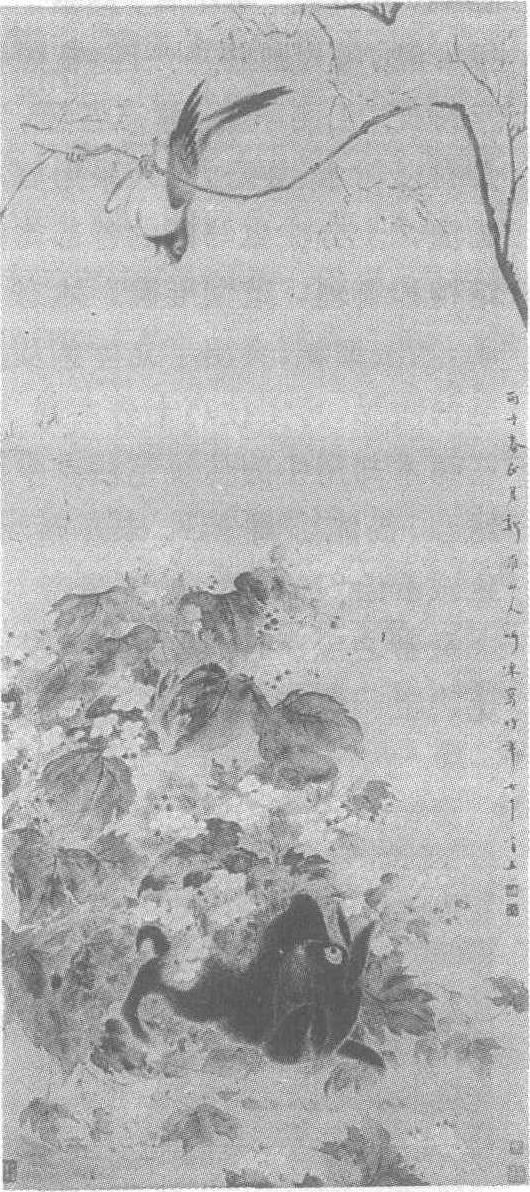 | 释义 | 华喦海棠禽兔图轴清。华喦(见《华喦山鹊爱梅图轴》条目)绘。纸本设色。纵135.2厘米,横62.5厘米。北京故宫博物院藏。树上栖一山鹞,蓄势下击,准备突袭秋海棠丛中暗藏的黑兔。用干笔枯墨,山鹞的窥视和呜叫与黑兔紧张的回顾遥相呼应,神情栩栩如生。坡下花叶浓艳生香,构图简洁,刚柔并济,妍雅鲜丽,风格清新秀劲。自识:“丙子春正月,新罗山人呵冻写,时年七十有五。”钤<华喦>、<秋岳>二印。丙子为乾隆21年,即公元1756年。