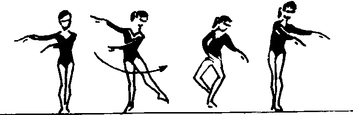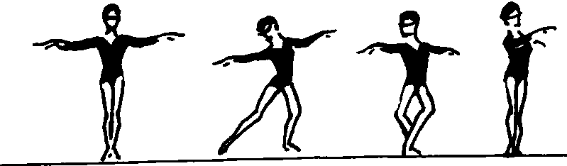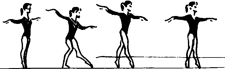 ❷后退华尔兹步:第1拍右脚向后做柔软步,步幅可稍大,落地屈膝,身体随之转动,第2拍左脚向后一次足尖步,第3拍右脚向后足尖步同时和左脚并立提踵。两臂由侧举开始,随动作前后平举摆动。