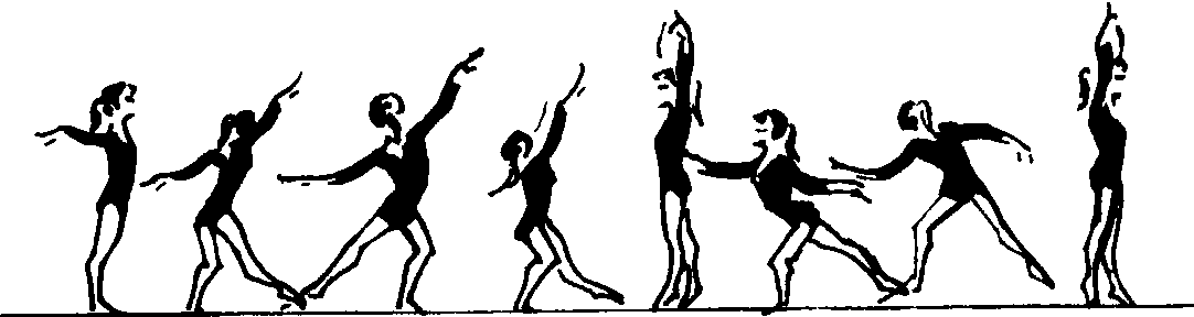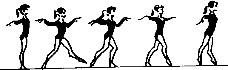 ❹转体华尔兹步:第1拍右脚向前柔软步落地稍屈膝,同时向右转体90°,第2拍左脚向前足尖步继续向右转体90°,第3拍右脚向左提踵并立。转体时右臂上举,左臂向后经下绕至上举。接着后3拍由左脚向后做华尔兹步并向右转体180°,同时右臂由前向后绕环至上举。 ❺华尔兹跑:第1拍左脚向左前上方自然跨出,经腾空后向前伸膝柔和落地,重心随之前移,同时上体稍向前侧倾。第2、3拍右脚开始向前做两次足尖小跑,右臂配合侧举做一次波浪。 动作要领 华尔兹3步的步幅要均匀,动作起伏要自然,重心随出步而移动。转体动作要准确、连贯,跑动时要轻快,两臂、身体、头部随动作协调配合。 教学重点 由慢速度开始体会动作,强调第1拍重心稍低,2、3拍重心升高。臂的动作从叉腰开始到两臂侧举做手臂波浪,逐渐增加各种手臂动作。