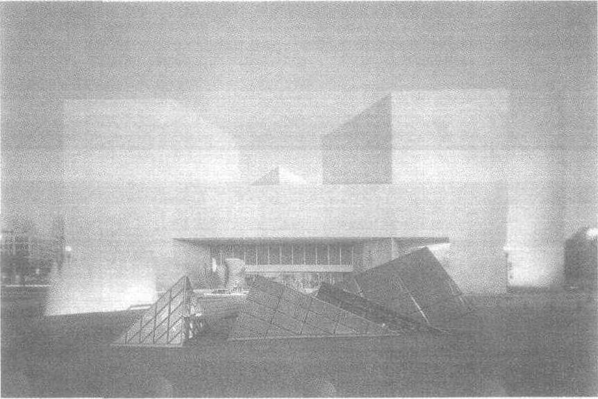 | 释义 | 华盛顿国家美术馆东馆1978年落成,位于华盛顿市中心宾夕法尼亚大道南侧3.64公顷的一块梯形地段上,东望国会大厦,西隔100m正对原国家美术馆(西馆),南面是大片林荫广场,四周均是中轴对称的古典风格的重要建筑。新建的东馆建筑顺应地段条件为梯形,沿梯形对角线划分为等腰三角形和直角三角形二部分,采取体块分割的手法使建筑成为极富雕塑感的几何体。西面对称的等腰三角形部分作为展览馆,和古典风格中轴对称的西馆正对,直角三角形部分为研究中心和行政管理用房,二者仅在四层联通,在等腰三角形上部升起的三个平行四边形的梭柱体与耸立的直角三角形体结合,组成了东馆上部轮廓变化而极具视觉冲击力的天际线。展览馆和研究中心入口分别在下部的凹口中,以梭边朝外的三角体划分大小二个主次出入口,表现出现代建筑在简洁的体量处理中,不拘泥于对称,灵活多变的表现手法。东西馆之间是一铺砌花岗石的小广场,广场下面是连接东、西馆的餐饮休息厅,可与广场上的游人共赏广场中央跌落而下的瀑布和喷泉,餐厅上部的五个大小不一的玻璃三棱锥体,既是采光天窗,又是与西馆呼应的建筑小品,观众沿地下通道自西馆来,可在此小憩,再乘自动步道进入东馆大厅的底层。东馆中心三角形中厅高25m,上为25个三棱锥组成的钢网架天窗,下挂一件可随厅内空气流动而变化的动态金属雕塑。各层天桥和回廊相互穿插,建筑内外墙面所用的大理石色彩、产地和墙面分格均与西馆相同,加强了新老馆形象之间的和谐关系。设计者为美籍华裔建筑师贝聿铭。