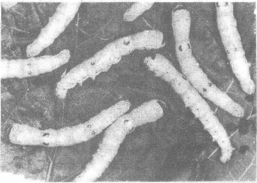 图 2 卒倒病病蚕症状 诊断与防治 病蚕频死前无明显的症状,刚死时手触尸体在腹部后端有硬块,头部缩入呈钩嘴状,有轻度尸僵现象。继而全身软化,随即变色腐烂发臭,这是肉眼鉴别的主要依据; 必要时取病蚕尸体放置一定时间后,做成临时标本或将消化管内容物涂片后作热固定,用1%结晶紫染色,在油镜下观察,菌体着色浓,伴孢晶体与芽孢不着色。如尚未确诊,可进行生物测定: 将蚕尸体放置一定时间后,取其内容物加无菌水研磨,将上清液涂于桑叶上添食于蚁蚕或2龄蚕,如引起急性中毒病,便可确诊。 卒倒病的防治方法主要是防止蚕食下卒倒菌的毒素。❶用1%有效氯漂白粉液、2%甲醛石灰水和毒消散等消毒药剂进行蚕室、蚕具消毒; 地坑的表土用漂白粉液消毒后,再洒上石灰,使形成隔离层则效果更佳; 蚕体、蚕座消毒可用3%有效氯漂白粉防僵粉,如发现病蚕或发病中心,应立即清理、消毒、隔离病蚕,以防蔓延; 妥善处理病死蚕及其排泄物,以减少病原扩散。 ❷驱除桑树害虫,在蚕桑生产较集中的地区,应合理施用细菌农药,也不能用施过细菌农药的稻草、麦杆等供养蚕使用。被细菌农药等污染的桑叶,可用0.3%有效氯漂白粉液喷洒,进行解毒处理。 ❸通风排湿,保持蚕座干燥,减少蚕座内传染的机会。添食氯霉素等抗菌素,有一定的预防效果,使用方法与败血病相同。 |