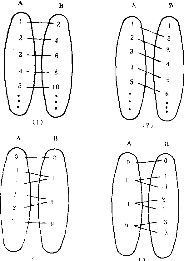 的一个单值对应,即映射.记作f(a)=a2.单值对应Danzhi duiying给定两个集合A和B,如果按照某种对应关系,集合A中的每一个元素在集合B中都有唯一确定的元素与它对应,这样的对应关系就叫做集合A到集合B的一个单值对应(或叫做集合A到集合B的一个映射)。例如,上面“对应”中列举的四个图中, (1)、(2)、(3) 都是单值对应, 而(4) 不是单值对应。