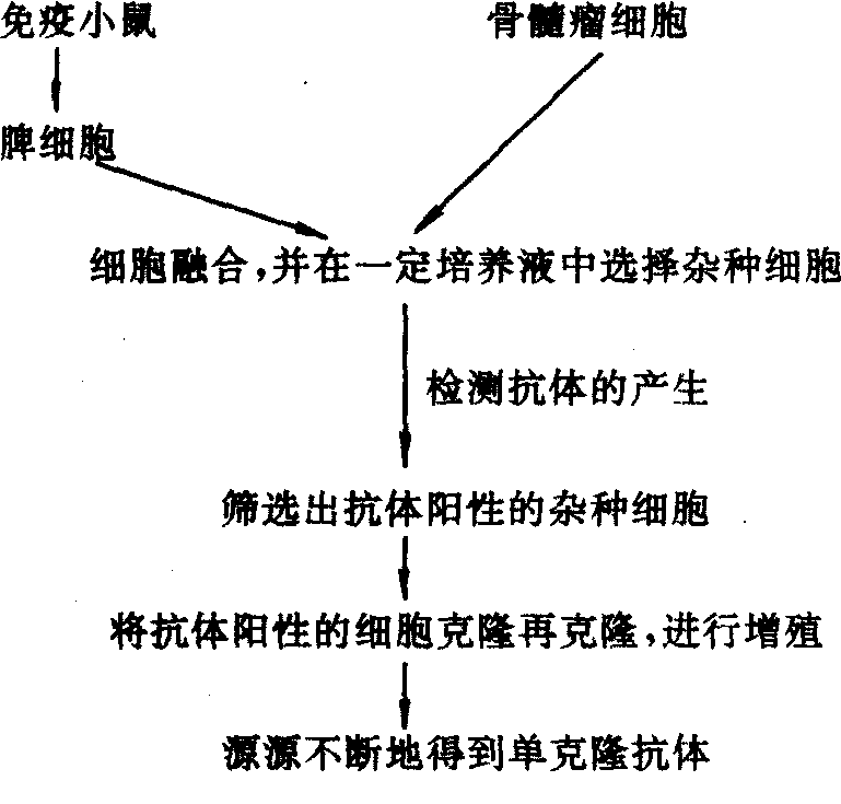 由于单克隆抗体有较高的灵敏度和特异性,所以有很大的应用价值,可进行一些疾病的诊断和治疗,如对绒毛膜促性腺激素、生长激素等的测定,以诊断有关疾病,以及进行对乙型肝炎及某些肿瘤的诊断等,它和药物结合能制成“导弹药物”到达体内专一部位,以进行对某些疾病的治疗。在科研上,单克隆抗体也是一种有力的研究工具。 单克隆抗体monoclonal antibody由克隆化的B细胞杂交瘤所产生的、结构高度均质的,针对特定抗原的免疫球蛋白。1975年克勒 (G. Kohler)和米尔斯坦(C.Milstein) 建立淋巴细胞杂交瘤技术,他们将具有代谢缺陷型的小鼠骨髓瘤细胞与经抗原免疫后的小鼠脾细胞,在聚乙二醇的作用下融合,然后在含次黄嘌呤(H)、氨基蝶呤(A)和胸腺嘧啶核苷 (T)的HAT培养基上选择培养。骨髓瘤细胞因缺乏利用次黄嘌呤的酶,不能生长,未融合的脾细胞在体外培养时间一般不超过两周,只有融合的瘤细胞能在 HAT培养基上生长。通过抗体检测和细胞的克隆化,即可获得克隆化的杂交瘤细胞株。此杂交瘤细胞具有两个亲代细胞的遗传性,它既能无限增殖,又能分泌特定的抗体。由此杂交瘤细胞株所产生的抗体即单克隆抗体。杂交瘤细胞株可在液氮中长期冻存,用时解冻复苏,即可在细胞培养上或接种到同系小鼠腹腔中进行生产。杂交瘤细胞株一旦选育成功,只要其染色体不丢失,就可长期用来生产针对特定抗原的单克隆抗体。 单克隆抗体简称“单抗”。通过单克隆的培养而产生的一种结构、氨基酸排列顺序和特异性完全一致的抗体。具有高度的特异性和专一性,只与一种抗原决定簇起反应,广泛用于医学和生物学各门学科的研究和临床疾病的诊断及治疗。单抗的问世,被认为是医学和生物学领域的一场革命。由于单抗可携带放射性同位素、药物、毒素等到达机体内部的特定病变部位(如肿瘤),从而起到诊断和治疗的作用,因此又被称为“生物导弹”。但单抗的这种用途还处于临床实验阶段。(参见“B细胞杂交瘤”) 单克隆抗体杂交瘤细胞在培养过程中产生的单一类型的抗体。用于疾病的诊断、流行病监测、疫苗研制、以及基础生物学和医学方面的研究。 单克隆抗体monoclonal antibody由克隆化的B细胞杂交瘤所产生、结构高度均质、针对特定抗原的免疫球蛋白。1975年克勒(G.Kohler)和米尔斯坦(C.Milstein)建立淋巴细胞杂交瘤技术,他们将具有代谢缺陷型的小鼠骨髓瘤细胞与经抗原免疫后的小鼠脾细胞,在聚乙二醇的作用下进行融合,再在含次黄嘌呤(H)、氨基蝶呤(A)和胸腺嘧啶核苷(T)的HAT培养基上选择培养。骨髓瘤细胞因缺少利用次黄嘌呤的酶,不能生长,未经融合的脾细胞在体外培养时间一般不超过两周,只有融合的瘤细胞能在HAT培养基上生长。通过抗体检测和细胞的克隆化,可获得克隆化的杂交瘤细胞株。杂交瘤细胞具有双亲细胞的遗传性,既能无限增殖,又能分泌特定的抗体,这种杂交瘤细胞株所产生的抗体即单克隆抗体。单克隆抗体特异性强、效价高、均质性好,可制备标准化诊断试剂,大大提高免疫诊断水平;对各类活性物质分析、各种细胞产物及其受体研究和遗传工程中基因表达产物的检测中都能发挥巨大作用;另在免疫防治中也具有广泛的应用前景。 |