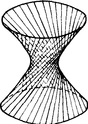 单叶双曲面(a,b,c>0)是直纹曲面.它可由或来产生,这里λ,μ是参数,这两族直线分别叫做单叶双曲面的λ族母线和μ族母线. 经过单叶双曲面上的任一点有且仅有每一族中的一条母线. 这两族母线无公共直线. 同族的两条母线必不共面,不同族的两条母线必共面. 同族的三条直母线不平行于同一个平面. 单叶双曲面有且仅有两族母线,其上的直线不属于λ族即属于μ族,见图.