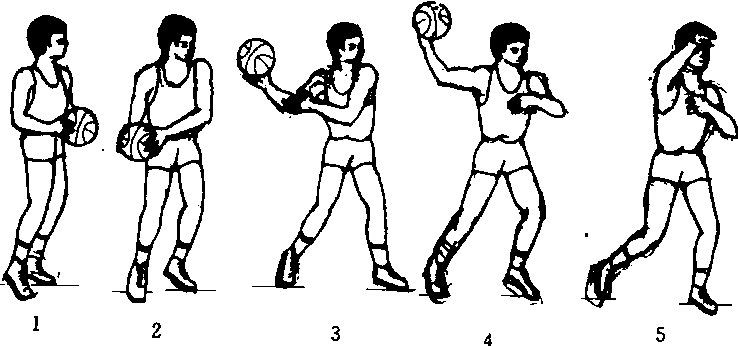 教学重点 ❶徒手模仿练习。体会传球的用力顺序。 ❷二人单手肩上传球练习。掌握传球时的甩臂和扣腕动作。 ❸抢篮板球后远距离单手肩上传球练习,培养与发动快攻战术相结合的能力。 单手肩上传球是单手传球中一种最基本的方法。这种传球力量大,球飞行速度快,常用于中、远距离传球。特别是长传快攻多采用这种传球方法。其持球手法与双手胸前传球相同。双手持球于胸前,两脚平行开立。右手传球时,左脚向传球方向跨出半步,同时将球引至右肩侧方,右肩后转,左手扶球,右手持球后下方,手腕后屈,出球时,在右脚蹬地的同时转腰、转肩,带动右肘小臂向前摆,并向前扣腕以带动食指、中指、无名指用力拨球,将球传出。老年人练习时,先做徒手模仿练习,体会单手肩上传球的用力顺序,然后两人面对面做单手肩上传球练习,以掌握传球时的甩臂和扣腕动作。老年人练习时,在身体转动瞬间,注意用力连贯、协调,不宜过猛。 |