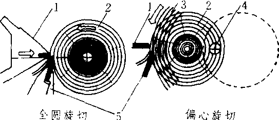 1.压尺 2. 木段 3. 旋切方向 4. 轴 5.旋刀