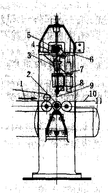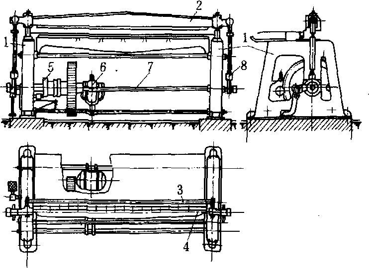 图1 机械驱动剪切机 6.电动机;7.主轴;8.偏心轮 命。砧辊的表层为耐磨的聚氨酯橡胶或氯丁橡胶。工作气压为0.3~0.5兆帕,最大剪切宽度2 700毫米。气动式剪切机剪切单板速度快,每分钟不少于200次,质量好,适宜于高速自动剪切。单板缺陷的切除,通常是人工操作,点动按钮进行,生产率低。随着高速、高度自动化新型旋切机和干燥机的出现,要求在旋切一剪切一干燥线上或旋切一干燥一剪切线上配置既能进行规格自动剪切,又能进行单板缺陷自动切除的高速自动剪切机。此种剪切机通常由剪切机、剪切机前后运输机、缺陷检测系统和电子控制系统4个部分组成。剪切机剪切动作越迅速,随缺陷剪去的有用单板越少。不同型号的剪切机剪切速度不同,最高可达每分钟1200次。为提高剪切速度,意大利研制出一种双轴滚刀式剪切机,用旋转剪刀进行剪切,每一刀轴上安装3把剪刀,每剪切一次转120度,两刀轴交替进行剪切,工作速度高达每分钟150米,能切除很小的缺陷,大大提高了处理单板的能力。早期的缺陷检测系统,是在单板的下方装有探测二极管来检测缺陷;新的方法是通过安置在单板上方的探测器(光电管式或扫描器)来检测其缺陷。有些剪切机,除了能检测穿透性缺陷,如空洞、边缘缺损、撕裂等,还能检测节疤、树皮和其他深色斑点等缺陷。电子控制系统的功能是把探测出的所有标准上允许存在的缺陷和不允许存在的缺陷与预置缺陷(即需切除的缺陷)参数进行比较,并控制剪切机相应动作,切除单板上不允许存在的缺陷。预置缺陷的参数(如空洞尺寸)可以方便地调节,以提高剪切效率。无需切除缺陷时,将预置规格尺寸进行定规格剪切。一般采用微处理机进行全机自动控制。 ![]() 图2 气动式剪切机 |
