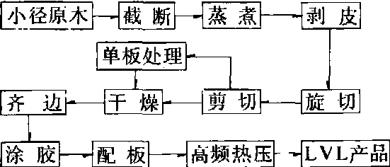 生产工艺 其工艺流程与胶合板生产类似(见图)。先将直径16~24厘米的小径原木根据其弯曲度和尖削度截成60~100厘米长的木段。高谷典良指出,落叶松小径原木经过60℃、24小时的软化处理和旋切机刀门的水平距离为单板厚度的90%时,旋出的厚单板质量最好。野崎兼司推荐热板、辊筒干燥联合使用,既能缩短干燥时间,又能保证单板干燥质量,单板从辊筒干燥机移到热板干燥机时含水率为30%。