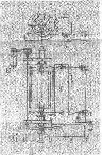 1.机座; 2.压尺; 3.刀床;4.旋刀; 5.进刀座; 6.离合器; 7.快速进退电动机;8.进刀箱; 9.链轮; 10.卡轴;11.卡轴箱; 12.主电机