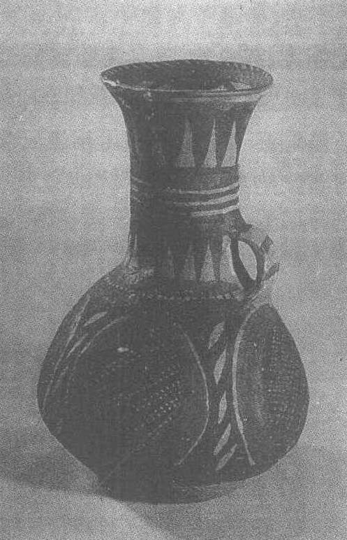 | 释义 | 单耳长颈彩陶壶新石器时代马家窑文化马厂类型。高19厘米,口径7.7厘米。1976年青海省乐都县柳湾出土。此器敞口、直颈、平底。颈肩结合部有一桥形耳。器物以红、黑两色彩绘。器口内沿纹饰由锯齿纹、平行纹,连弧纹组成。颈部红、黑相间的环纹带上下各有一层大锯齿纹。器腹绘四大圈纹,并以网纹填充。圈纹间以留白的方式点缀叶纹。马家窑文化的陶壶,形制多为双耳,鼓腹。这种长直颈,单耳,颈绘单色大锯齿纹的陶壶是较为少见的。马家窑文化见“束腰彩陶罐”条目。