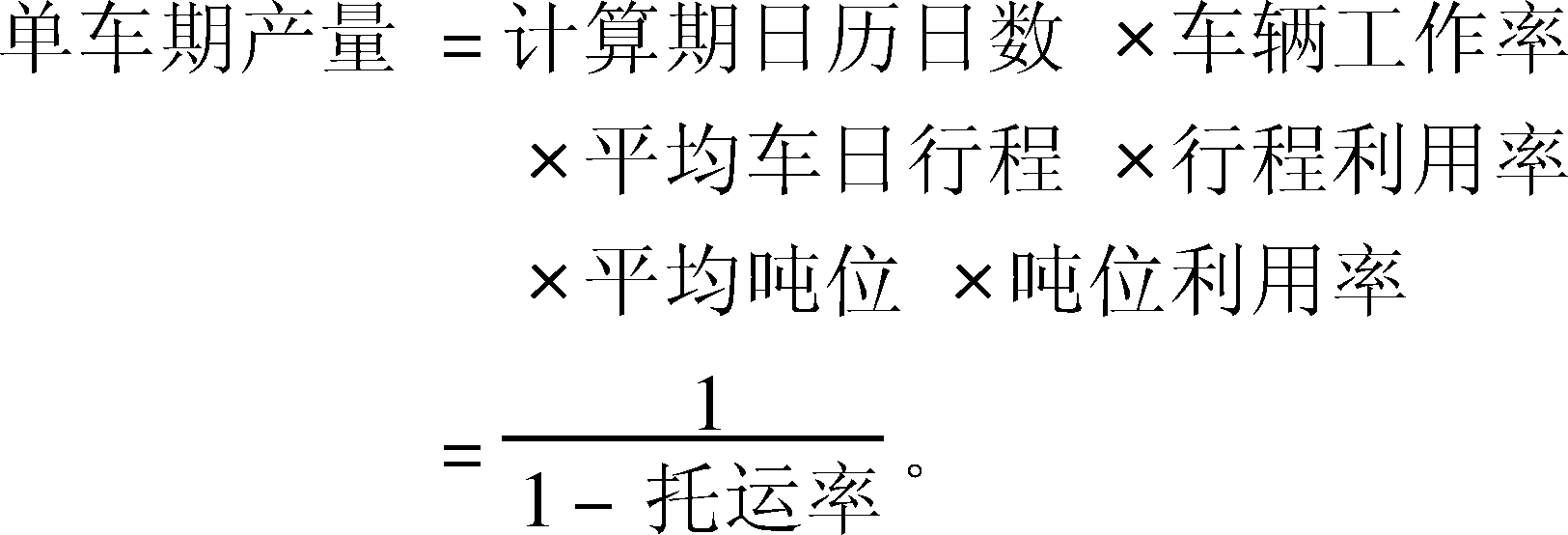 | 释义 | 单车期产量single vehicle period freight volume一定时期内平均每辆车完成的周转量。道路运输业务中反映汽车运输效率的综合指标。载货汽车以吨公里为计量单位,集中反映车辆在时间、速度、行程、载质量利用等方面的情况。单车期产量可根据需要分别计算单车年产量、季产量、月产量和日产量。计算公式为: