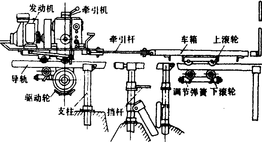 单轨运输车结构 运输车厢 常用钢管和板材制成,长1~2米,宽0.48~0.68米。车厢下部装有两组滚轮,上、下滚轮夹住导轨运行,运输车厢通过牵引杆与保险链和牵引机联接。上、下滚轮组对导轨工作面的夹持力及其支架的刚性可保证运输车的稳定性。滚轮对导轨的夹紧力大小可由弹簧压紧机构调节。 导轨 机组运行的通道,一般用50×50毫米方形薄壁钢管。当载重量大,支柱间距长时,采用60×60毫米方管。在导轨的上面或下面焊有冲压成型的齿条或冲圆孔穴。牵引机的驱动轮是齿形滚轮或柱状突起轮,它与导轨上的齿条或圆孔穴啮合运行,不会打滑,爬坡能力大。为了减轻导轨工作面齿条或圆孔的磨损,牵引机上备有自动注油装置,运行时向导轨面上滴油。为了消除导轨上的障碍物,通常在牵引机头前面装有排障板。 导轨用打入地下的镀锌钢管支柱支撑着,离地高度约0.25~0.6米。导轨的最小弯曲半径在垂直面内为3米,在水平面内为3.6米。支柱间距为1~2.5米。支柱上端以专用铁卡子及螺栓将导轨固定。导轨每节长6米,采用联接卡连接,通常以150米左右运距较多,也有长达数百米至上千米,也可在集中点架设数条运输线以提高运输效率。 单轨运输车普遍向着轻便、节能、高效方向发展。发动机动力传递方式逐步采用齿轮系传动,采用锥齿轮改变发动机安装方向,使机体小型化。驱动轮逐渐用双轮驱动方式,以提高乘载爬坡能力。由无乘座型运输向乘座型运输发展。电子遥控技术也将被应用到单轨车上。 |