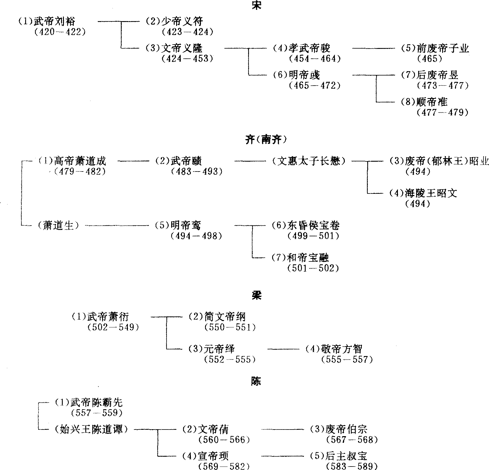 东晋灭亡后南方相继建立的宋、齐、梁、陈四个王朝的总称,皆都建康(今南京)。