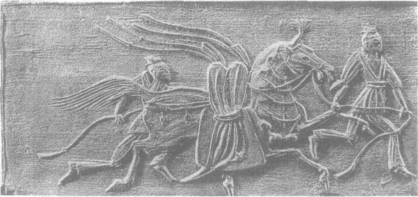 南朝画像砖 这里选的画像砖为河南邓县学庄墓出土,时代不晚于萧梁。墓砖妆彩,长38厘米,高19厘米,为模制薄浮雕。主要内容为四神、天人、车马出行、孝子故事等。车马出行是由若干单幅画面组成的长卷式构图,计有骑乘、仪仗、侍从、女侍,前拥后簇,车水马龙,好不热闹。而每一单幅又是构图完整的画面,可见设计之匠心。《鼓吹图》两人吹角在前,两人击鼓于后,可谓鼓角相闻、声声入耳。《驮马图》一人执缰于马前,一人尾随在马后,疾驰飞奔。两幅虽同属同一出行队伍,作者却运用线条的疾徐曲直、体积的阴阳变幻,创造了节奏迥异、意境不同的画面。 |
