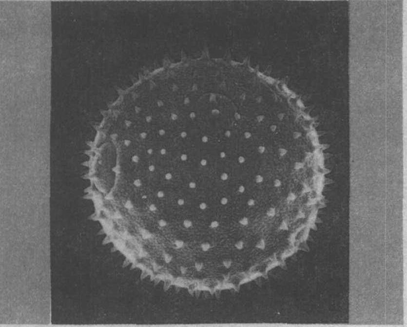 南瓜花粉粒圆球形,直径为90~150微米,具散孔,孔数约11~13个,大小为20微米,具孔盖,盖上具刺和颗粒状雕纹。外壁表面具刺状雕纹,刺分布均匀,长为4~5微米,刺末端渐尖,刺间表面具细颗粒。(见图)