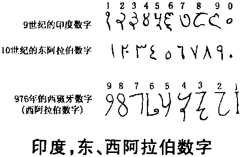 | 释义 | 976年关于“印度数码” 的最早记载出现在西班牙文手抄本中(用9个数字同位值的名称相结合的记数法),印度数字传入阿拉伯国家时,印刷术还没有发明,书籍全用手抄,字体因人因地而异,出入很大,这就是所谓的东阿拉伯(比利牛斯半岛)数字。12世纪时,东西两种形式逐渐合流(以西阿拉伯数字为主体),开始传人欧洲,所以欧洲人称其为“阿拉伯数字”。