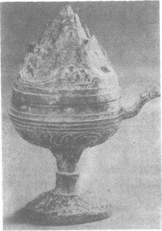 | 释义 | 博山铜炉西汉。焚香用的器具。盖雕铸为山形,上有羽人、走兽,故名。通高17.5厘米,口径8厘米,腹径9.5厘米,底径7厘米。重1.13公斤。北京市文物工作队在废旧物品中拣选。此炉盖上铸六座山峦,每座可区分为峰顶、山腰、山脚三层。其中一山腰间铸有长服踞坐人像,似为神仙。六个山脚满饰人兽形象:踞坐人像之下有人牵犬;其右第一山有熊搏虎及野猪相斗:第二山有猴戏熊;第三山有一人骑马,一人弹琴、一人吹奏;第四山有人与兽;第五山有一背负弓箭的猎人及一兽。山间镂孔。器身似豆(器名),子母口,鼓腹,腹中饰宽带纹及凸弦纹各一周,一侧有龙首状鋬,腹下饰卷云纹。喇叭状圈足,足座饰蟠螭纹。博山炉盛行于汉及魏晋时代。此博山炉与河北满城汉墓出土的炉的造型、纹饰相似,故定为西汉器物。