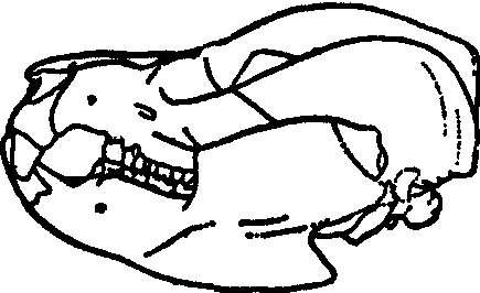图311 卞氏兽头骨(化石) 卞氏兽早期的哺乳动物化石,近似哺乳动物的一种古爬行动物。牙齿已初步分化,身体骨骼上也有许多与哺乳动物相似的性质。但下颌骨不是由单一的齿骨组成,仍有关节骨与上隅骨的残余。产于云南禄丰晚三叠世下禄丰群中,距今约2.05亿年。 |