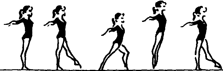 动作要领 蹬地腿向前一步,重心随之前移,稍屈膝成小弓步,再蹬地跳起,后腿向前并成3位,膝、脚面绷直,空中身体保持正直,收腹立腰。 教学重点 初学时先做慢动作,体会经弓步成3位提踵立,再练完整动作,然后换腿做,也可两腿交替做。 |