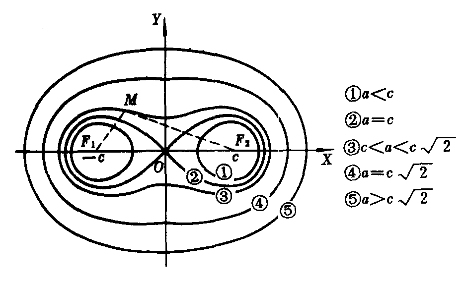 已知两定点F1和F2(|F1F2|=2c),满足|MF1|·|MF2|=a2的点M的轨迹(如图).