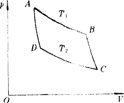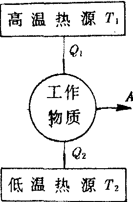 图 2 卡诺循环热力学中最理想的一种可逆循环。它以理想气体为工作物质,由四个连续的过程组成:等温膨胀并吸收热量,绝热膨胀,等温压缩并放出热量和绝热压缩。一切热力循环,在上下限温度(T1和T2)相同的条件下,卡诺循环热效率最高,它等于(T1-T2)/T1。 |