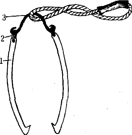 | 释义 | 卡钩tongs搬运木材常用的一种工具。多见于中国东北林区。由钢制的两个钩、两个环、一个梁构成(见图)。卡钩与扒门、肩杠、绳扣配套成人力装车和归楞(见木材归楞)的工具。其中卡钩起悬挂物件的作用。两人抬运木材时,用一个卡钩,一根绳扣,一根肩杠,卡钩挂住木材一头,抬起,木材另一头在地上拖行。4~8人抬木材时,用2~4个卡钩。