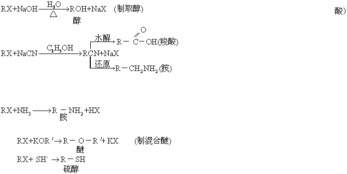 常温下除氯甲烷、溴甲烷、氯乙烷、氯乙烯等为气体外,一般卤代烃为液体,高级卤代烃为固体。卤代烃不溶于水,溶于多种有机溶剂,并能溶解多种弱极性或非极性有机物,是常用的溶剂。碘代烃、溴代烃以及多数多卤代烃的相对密度大于1。随卤代烃分子中卤原子数目的增多其可燃性降低。卤代烃的沸点随碳链增长而升高。同分异构体中,支链越多,沸点越低 (氟代烷除外)。 卤代烃用途极为广泛,除用做溶剂外,还可做致冷剂、灭火剂、麻醉剂及防腐剂等。卤代烃的化学性质非常活泼,在有机合成中占有重要位置。 卤代烃发生亲核取代反应,可生成多种化合物:R:X+:Z-→R:Z+:X- Z-=OH-,CN-,RO-亲核试剂 离去基团