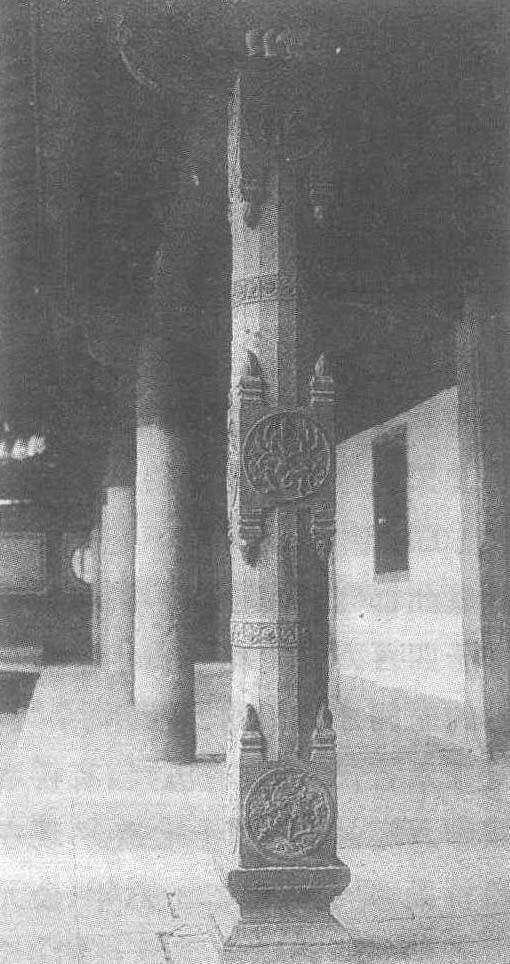 | 释义 | 印度教石柱元。高250厘米。这是福建省泉州市开元寺大雄宝殿后廊的一对石柱。石柱整体为16边形,上、中、下三段各加工一边长32厘米的正方形。正方形角端刻须弥座形台,上托含苞欲放的荷蕾。正方形表面圆形开光内,浮雕印度教神话故事“黑天(克里希那)与迦娄叱角力”、“阎摩那河七女入浴”、“毗湿奴骑金翅鸟现身救象”等24幅。图间夹饰双狮戏球,凤穿牡丹,莲花、菊花等我国传统的吉祥图案和佛教艺术中的生命之树,鹿狮教子等纹样。这是一对我国目前仅见的印度教石柱。其将绘画技法同石刻技巧融为一体,恒河文化与闽南艺术汇于一柱,是不可多得的石雕艺术佳作。