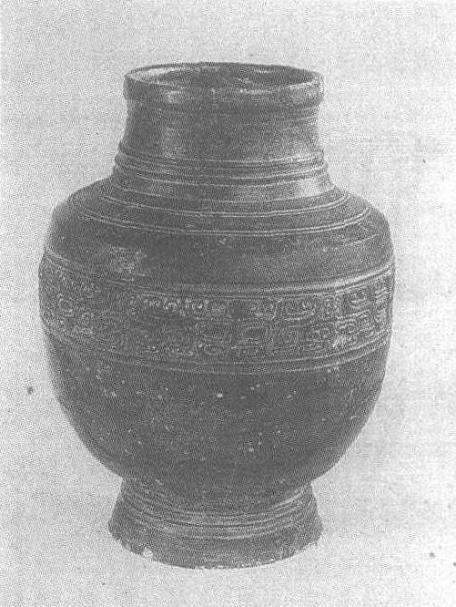 | 释义 | 印纹陶罍商。高31厘米,口径12.4厘米。1953年河南省郑州市二里岗出土。北京中国历史博物馆藏。商代青铜器多为王室和贵族使用,平民在日常生活中仍以使用陶器为主。出于对权贵者使用青铜器的仰慕,民间出现了仿效青铜器的陶器。此印纹陶罍即是一例:唇口、直颈、深腹、圜底、圈足,颈、肩、足均饰弦纹,腹部饰一周二方连续的兽面纹图案。胎质为细泥黑陶,坚硬细腻。整个器物造型端庄,表面经仔细磨光,乌黑发亮,是二里岗陶器的精品。