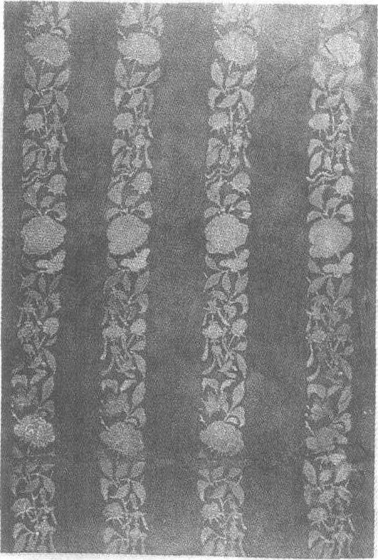 | 释义 | 印金彩绘芍药绶球花边南宋。长52厘米,宽16厘米。1975年福建省福州北郊浮仓山淳祐三年(公元1243年)黄生墓出土。福建省博物馆藏。此花边先用凸版在上了薄浆熨平的丝织品上染金粉浆料,印出花纹的轮廓,然后填敷色彩,其花样单位长16.5厘米,宽2.0厘米。芍药花为粉红色,叶为灰蓝、灰绿色,蝴蝶为橘黄色,绶球为铁红、黄等杂色。花边纹饰写实,其纹样精美生动。南宋女式服装常用此类花边作镶饰之用。