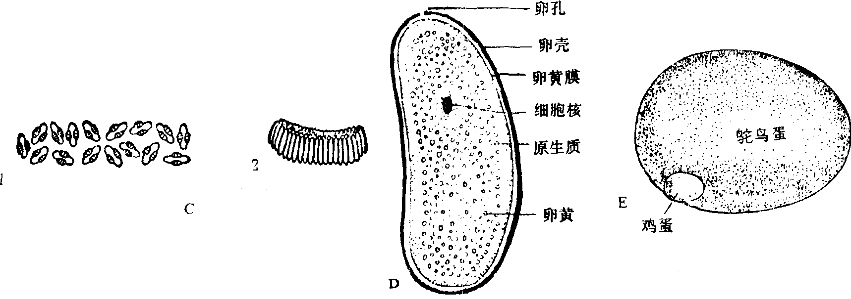 | 释义 | 卵luan动物的成熟而未受精的雌性生殖细胞,称为卵或称蛋。不同种类动物的卵,有大有小。鸵鸟蛋的直径可达10厘米,寄生蜂的卵极小,只能用产卵管把卵产在其他昆虫的卵内。卵的颜色一般为白色、淡黄色、淡绿色。多数鸟卵的卵壳上有点斑、块斑、环斑、条纹等,形成多种颜色的保护色。卵的大小决定于卵中的积累的营养物质的多少。多不能活动。形状多种多样,一般呈圆球形或椭球形。有的海鸟的卵呈陀螺形。昆虫卵的形状较多,有的呈馒头形如粘虫;有的呈长条形如菜粉蝶;也有的为扁形、似西瓜籽,如玉米螟的卵。有的为单粒,如大豆的天蛾卵;有的呈卵块,如玉米螟的卵;有的成堆,如蝼蛄的卵;有的卵块外面覆盖鳞毛,如三化螟;蝗虫的卵块外包有泡沫塑料状的卵袋。无论是哪一种昆虫卵,其结构大致相同,外包有卵壳,内有卵黄膜、细胞质、细胞核、卵黄,在卵壳的顶端有1个极为微小的卵孔,为精子进入卵的通道。卵壳上一般都具有不同形状的条纹、短毛或刺。在靠近卵孔的周围,还有不同形状的花纹,称为花冠区;在花冠区的外围常有各种形状的纵棱和横格。哺乳动物的卵极小,小鼠卵的直径为75~100微米,狗的卵约为140微米,人的卵也仅有135微米。卵外有透明带包着,此外,还有辐射状排列的放射冠。由于高等哺乳动物在母体子宫内发育,卵内的卵黄极少。
