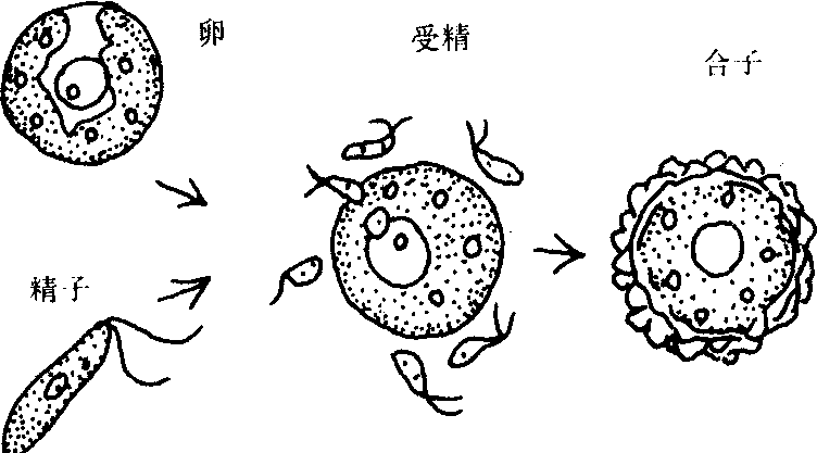 图553 团藻的卵式生殖 卵式生殖oogamy卵与精子结合的一种有性生殖。大而无鞭毛、不能运动、具丰富营养物的为卵;小而有鞭毛,能运动的为精子。是显著分化的高级的异配生殖,是多细胞生物普遍具有的生殖方式。海带、地钱、水螅(Obelia)等为卵式生殖。 |