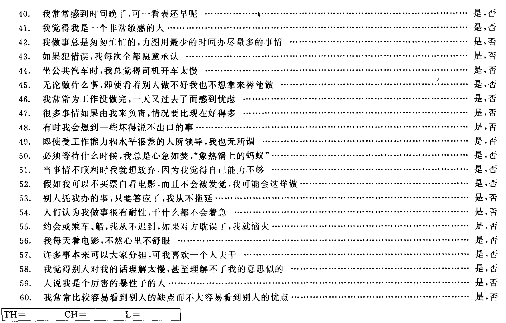 | 姓名____性别_____年龄_____ 文化____籍贯_____职业_____诊断_____病程____病程请回答下列问题。凡是符合您的情况的就在“是”字上打个对号;凡是不符号您的情况的就在“否”字上打个对号。必须回答每个问题,答案无所谓对与不对、好与不好。请尽快回答。不要在每道题目上太多思索。回答时不要考虑“应该怎样”,只回答您平时“是怎样的”就行了。1. 我常常力图说服别人同意我的观点 ……… 是,否2. 即使没有什么要紧事,我走路也很快……… 是,否3. 我经常感到应该做的事情很多,有压力……… 是,否4. 即使是已经决定了的事,别人也很容易使我改变主意……… 是.否5. 我常常因为一些事大发脾气或和人争吵 ……… 是,否6. 遇到买东西排长队时,我宁愿不买……… 是,否7. 有些工作我根本安排不过来,只是临时挤时间去做……… 是,否8. 我上班或赴约会时,从来不迟到……… 是,否9. 当我正在做事,谁要是打扰我,不管有意无意,我都非常恼火……… 是,否10. 我总看不惯那些慢条斯里、不紧不慢的人 ……… 是,否11. 有时我简直忙得透不过气来,因为该做的事情太多了 ……… 是,否12. 即使跟别人合作,我也总想单独完成一些更重要的部分 ……… 是,否13. 有时我真想骂人………是,否14. 我做事喜欢慢慢来,而且总是思前想后 ………是,否15. 排队买东西,要是有人加塞,我就忍不住指责他或出来干涉………是,否16. 我觉得自己是一个无忧无虑、逍遥自在的人 ………是,否17. 有时连我自己都觉得,我所操心的事远远超过我应该操心的范围 ………是,否18. 无论做什么事,即使比别人差,我也无所谓………是,否19. 我总不能像有些人那样,做事不紧不慢 ………是,否20. 我从来没想过要按照自己的想法办事………是,否21. 每天的事情都使我的神经高度紧张………是,否22. 在公园里赏花、观鱼等,我总是先看完,等着同来的人 ………是,否23. 对别人的缺点和毛病,我常常不能宽容 ………是,否24. 在我所认识的人里,个个我都喜欢 ………是,否25. 听到别人发表不正确见解,我总想立即就去纠正他 ………是,否26. 无论做什么事,我都比别人快一些 ………是,否27. 当别人对我无礼时,我会立即以牙还牙 ………是,否28. 我觉得我有能力把一切事情办好………是,否29. 聊天时,我也总是急于说出自己的想法,甚至打断别人的话………是,否30. 人们认为我是一个相当安静、沉着的人 ………是,否31. 我觉得世界上值得我信任的人实在不多………是,否32. 对未来我有许多想法,并总想一下子都能实现 ………是,否33. 有时我也会说人家的闲话………是,否34. 尽管时间很宽裕,我吃饭也快 ………是,否35. 听人讲话或报告时我常替讲话人着急,我想还不如我来讲哩! ………是,否36. 即使有人冤枉了我,我也能够忍受 ………是,否37. 我有时会把今天该做的事拖到明天去做………是,否38. 人们认为我是一个干脆、利落、高效率的人………是,否39. 有人对我或我的工作吹毛求疵时,很容易挫伤我的积极性 ………是,否 |