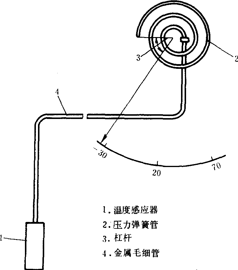 压力温度计示意图 压力式温度计由温度感应、读数记录、压力传递等3部分组成, 见图。❶温度感应部分, 即温包。内充甲醇、二甲苯或纯净的煤油等液体, 也有充以20~30大气压的氮气或氯甲烷等蒸气的。外壳用钢、不锈钢、铜或黄铜制成圆筒状, 筒的一端封闭, 另一端和传递压力的金属毛细管连接。 ❷压力传递部分, 即连接温度感应器与压力弹簧管的金属毛细管, 用钢或铜制成,内径为0.2~0.5毫米,壁厚0.5~2.0毫米。 ❸读数记录部分, 包括压力弹簧管, 用钢或黄铜制成, 其截面为扁平形和椭圆形, 弹簧管一端与金属毛细管连接并固定在支架上, 而另一端是封闭的自由端, 通过杠杆能带动指针或记录笔动作。当温度感应器受热时, 在其中的液体或气体压力升高, 经毛细管传到弹簧管, 使弹簧管由于内壁压力增加而略微伸展, 当温度感应器受冷时, 液体或气体压力降低, 压力弹簧管的弹力就迫使它本身卷曲, 经杠杆带动指针或记录笔移动, 就能指示所感受的温度值。这种仪器的优点是不需供应电源, 机械强度大, 不怕振动, 能隔测和自动记录。主要缺点是压力传递部分内的感温液体, 其压力随环境温度变化而变化, 从而引起误差, 故已很少应用。多改为接点式控温装置, 用于温室等设施中界限温度的报警和温度控制。 |