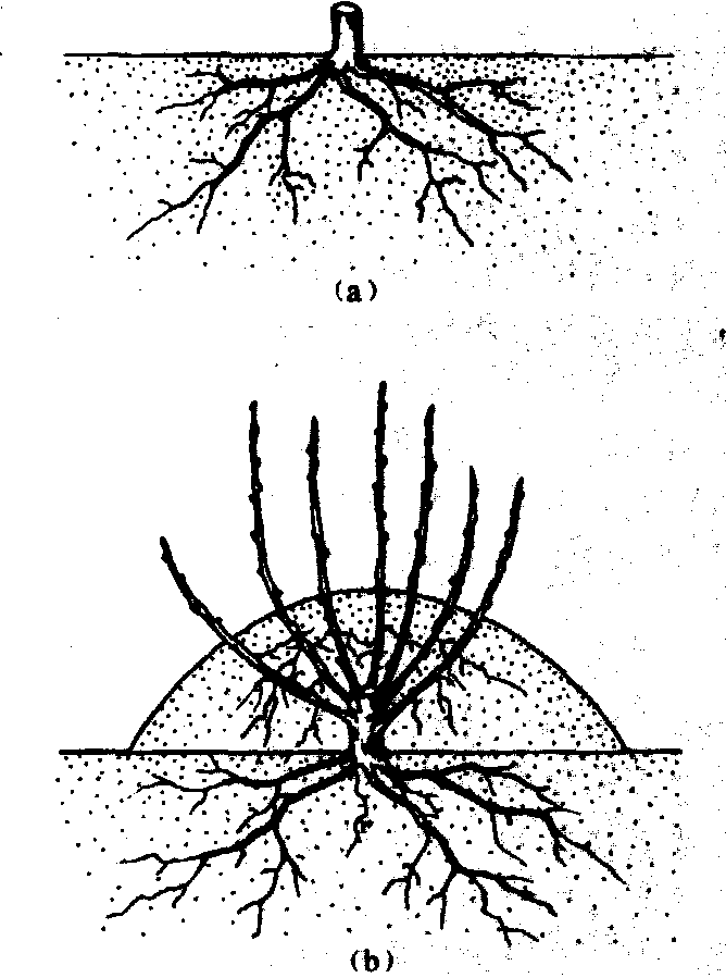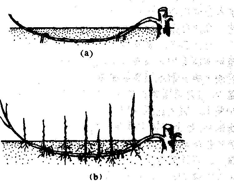 图 1 培土压条 (a) 母株枝条剪截状; (b) 培土后生根状 水平压条 又称开沟压条。主要在春季萌芽前进行。有的果树如葡萄也可在生长季节的雨季作绿枝水平压条。母株斜栽利于压埋, 选用靠近地面或部位低的枝条, 剪去上部不充实部分, 顺枝条着生方向开放射状沟, 深2~5厘米, 将枝条水平压入,用钩状物(枝杈或铁丝)固定,上覆少量松土, 埋没枝条, 芽萌发后可再覆薄土,促进枝条黄化。新梢长达15~20厘米,基部半木质化时再培土。1个月后再次培土,管理方法同培土压条。年末即可起苗, 将基部生根的小苗自水平枝上剪下即成自根苗(图2)。保留靠近母枝的1~2株小苗, 供翌年重复压条。本法初期繁殖率较高, 约为培土压条法的1~2倍, 但压条时需用钩状物固定, 比较费工。
