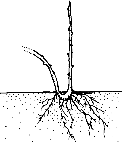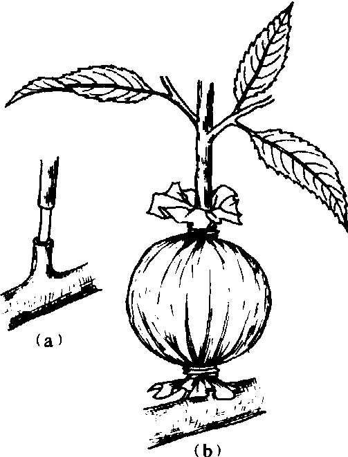 图 3 空中压条法 先端压条 又称梢尖压条。母株直立栽植, 8月间将新梢先端埋入土中, 当年便在叶腋处发出新梢和不定根, 成为秧苗。也有将1年生枝先端埋土中后长成幼苗图4)。黑树莓、醋栗等枝条细软, 生根容易, 都用这种方法繁殖。 注意事项 主要有❶须在地势平坦、土壤疏松肥沃、具有灌溉条件又排水良好的地方, 建立较长久性的压条繁殖圃。 ❷母株按行距1.5~2米、株距0.3~0.5米的距离栽植,栽植当年培养母株不行压条繁殖。 ❸压条前对压条株进行创伤处理, 如刻伤、环割、绞缢、环状剥皮以及折裂等, 并结合使用吲。 ❹培土前先灌水,并疏除密集新梢, 培土时需细心,避免压坏或碰坏新生枝条。雨后及时修整、培土。 ❺落叶果树压条苗在年末落叶后分株出圃, 常绿果树多在生长缓慢阶段分株, 分株时切口光滑平整, 剪除过长的母枝枝段。