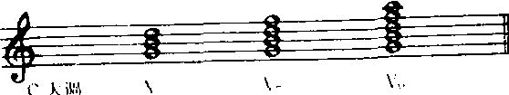 以和弦的根音为最低音的和弦。原位三和弦只标记表示该和弦级数的罗马数字,不加任何附加标记,七和弦在罗马数字右下角附加标记“7”,九和弦在罗马数字右下角附加标记“9”。如: (以C大调为例)