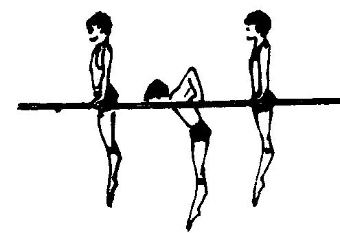 杠上支撑开始,借助臂的屈伸,使身体做上、下升降运动。用于发展上肢力量。动作要领 由杠上支撑开始, 肩稍前移弯曲成屈臂支撑;身体自然下落。然后,臂用力向上推起,身体上升还原成直臂支撑。保护与帮助 保护者站在练习者侧方位置, 两手扶持两腿帮助慢落。然后, 用力帮助上推成支撑。教学重点 落下时两肘内收, 慢屈臂; 推撑时挺胸立腰, 两肘内收用力。