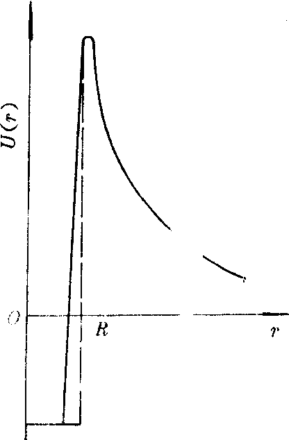 下图为原子核对α粒子(及其他带电粒子)散射实验中的势能曲线。图中纵坐标表示势能U(r),横坐标表示离核心的距离r。从图中可以看到在r>R(R的数量级为10-13厘米时,原子核与α粒子之间只有库仑斥力,核力为零,其势能曲线具有双曲线的形状。而当r略小于R时,势能变号,曲线迅速下降形成势阱。出现此种现象的原因是当r略小于R后核力迅速增大,此时库仑力与核力相比已无足轻重。由此曲线显示出核力有一个明显作用区域,这个作用区域以内核子存在的概率很高,而超出这个区域,概率很快降为零,因此使得原子核的边界面比较明确,如果忽略弥散的原子核的边界层,也忽略形变,近似把原子核看成密度均匀半径为R的球,R称为核电荷分布半径。根据实验资料,核半径R与原子核质量数A的1/3次方成正比,即R=r0A1/3。式中r0为比例常数。这个数值较精密的测量值为1.2×10-15米。因此原子核的半径的数量级大约为10-15~10-14米,相当于原子半径(1010米)的万分之一。这就是说原子核的体积只相当于原子体积的万亿分之一。