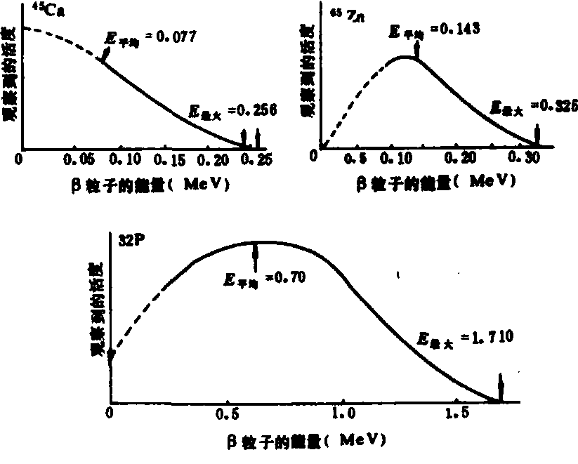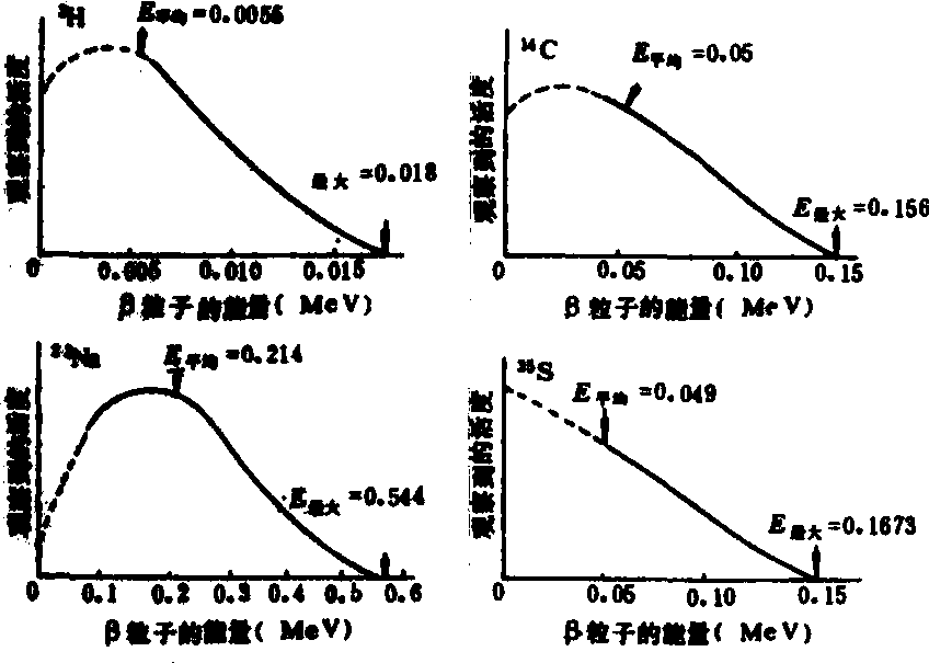 | 释义 | 原子核衰变nuclear decay原子核自发地放出射线并转变成另一种核素或过渡到另一种状态的现象。也称放射性衰变(radioactive decay),简称衰变。衰变不受外界条件(如温度、压力、酸碱度等)的影响。衰变前的核素称母体,衰变后的核素称子体。若子体仍为放射性核素,则还会衰变成第二代子体,……以至发生多次衰变,产生多代子体,直到变为稳定性的核。每个核的衰变机会在一定时间内是均等的,但并非同时发生,其衰变过程遵循随机性规律。衰变放出的射线会与物质相互作用,其作用过程随射线性质而异。 AZX→AZ+1Y+β+ 式中 AZX和AZ+1Y分别表示母、子体; 表示反中微子,不带电,静质量近似于零。β粒子的动能Eβ的值可从零至最大值Emax(Q),从而形成一个连续能谱(图1)。谱线有个最大能量Emax,在其1/3处的β粒子数有一高峰。一般图表上给的Eβ均指Emax。较多β衰变的放射性核素只放出β粒子,即转变成另一个基态(稳定)核。例如,农业化学研究中利用的3H、14C和32P等,都分别放出β粒子就转变成稳定的3He、14N及32S。有不少核素则放出β粒子时,还伴随放出γ射线。例如137Cs和131I在分别放出2组和4组β射线时,还分别放出1组和7组γ射线而转变成基态137Ba和131Xe。β+衰变 从原子核内放射β+粒子的过程。β+粒子的质量和电量与β粒子的相等,仅电荷符号相反,因此,β+粒子实质上就是正电子。β+衰变可用下式表示: AZX→AZ-1Y+β++ν+Q 式中 ν表示中微子,其性质与反中微子的基本相同,只是其运动方向与自旋方向相反。发生β+衰变的必要条件是:母子体的质量差大于1.02兆电子伏(MeV)即电子静质量的2倍。当β+粒子损失动能时,会与物质中的电子结合而产生湮没辐射(0.51兆电子伏),即两个正负电子的静质量转化为电磁辐射(也称光化辐射),一般以产生两个光子最普遍。 电子俘获(EC) 原子核俘获一个核外绕行电子而使核内一个质子转变成中子和中微子的过程。它可用下式表示: AZX→AZ-1Y+ν+Q 由于K壳层电子离核最近,K电子被俘获的几率较其他壳层(L、M、……)的大,所以,电子俘获又常称K俘获。在发生K俘获时,除有些子体处于激发态放出γ射线外,核并不发射其他任何易于探测的射线,但有次级辐射即特征X射线或俄歇电子发射。这些次级辐射来源于能态较高的(如L壳层)电子跃迁到能态较低(如K壳层)空穴时,将两能态能量差转变成特征X射线放射出来。农业化学研究中应用的65Zn,在进行电子俘获(98.50%)时,放出1.115兆电子伏γ射线外,并放出8千电子伏的特征X射线。或者这能量差传递给另一L电子,使其发射出来,该电子称为俄歇电子(Auger)。这两种次级辐射都是单色并可探测的,通过探测可判断电子俘获的发生及测知其含量。