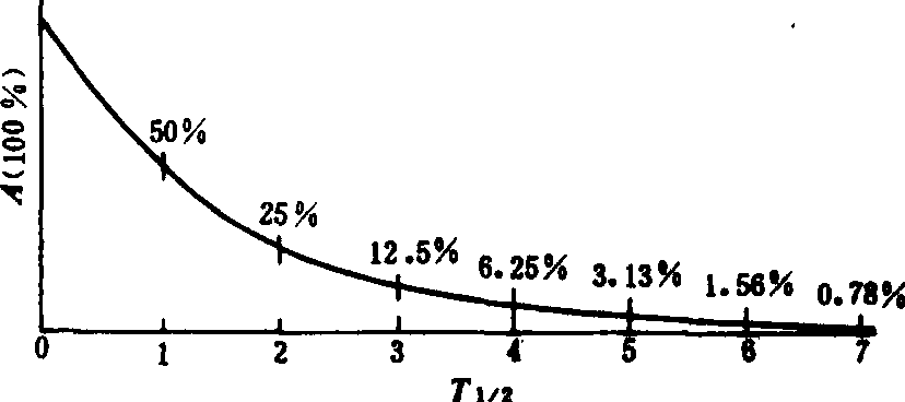 图1 几种常用放射性核素的β能谱曲线 γ衰变 原子核从激发态跃迁到较低能态或基态时放射γ射线的过程。一般γ衰变是伴随α和β衰变一起发生的。γ射线是一种与X射线无本质区别的不带电的电磁波,只是γ射线是从核内发射,其波长较X射线的短。γ衰变对原子序数和质量数均无影响。因此,该衰变又称同质异能跃迁(IT)。有时核并不放出γ射线,而将其能量直接给予轨道电子使其逸出,这过程称内转换。放出的电子称内转换电子。例如,6027Co在进行β衰变时,同时连续发射1.17和1.33兆电子伏的γ射线(99.9%),并放出1.16和1.32兆电子伏的内转换电子(分别为1.67%和1.27%),最终转变成6027Ni。 衰变规律 原子核衰变及其衰变速度由原子核内部的特征所决定,不受外界条件影响。衰变是一个随机过程,但遵循一定的规律。衰变产生的子体有的稳定,称单次衰变;有的不稳定,会连续衰变产生多代子体,称多次衰变。在农业化学研究中,主要利用的是单次衰变核素。 单次衰变定律 单次衰变核素的核数随时间按指数规律衰减,其数学表达式为 N=N0e-λt 式中 N0表示t=0时未衰变的原子核数;N表示经过时间t后未衰变的核数;λ为比例常数,称衰变常数;t为经过的时间。 在实际应用中,往往需知道在单位时间内发生核衰变的原子数,即衰变率-dN/dt,也称放射性活度A(简称活度)。其严格定义:处于特定能态的一定量放射性核素在给定时刻的活度A是dN/dt的商。dN是在时间间隔dt内,由该能态发生衰变的期望值,即A=-dN/dt。由于-dN/dt∝N。因此,上述单次衰变定律可写成A=A0e-λt。式中A0和A分别表示在t=0时和经过时间t时的放射性活度。 衰变常数λ的量纲是时间的倒数。它表示单位时间内,在N个放射性原子中可望发生衰变的机率,即λ=(-dN/dt)/N。λ值大衰变得快,反之则慢。因此,λ可直接量度放射性核素的不稳定性。每种放射性核素的给定衰变过程都有特定的λ值。λ随核素而不同,且在相当大的范围内变化。半衰期T1/2也是核素的一种量度。定义为放射性原子数N或衰变率减少到原始一半时所需的时间,也称物理半衰期Tp。T1/2长表示衰变得慢;短则快。放射性活度与T1/2的关系如图2所示。T1/2的单位用秒、分、时、天或年。λ和T1/2的关系为: