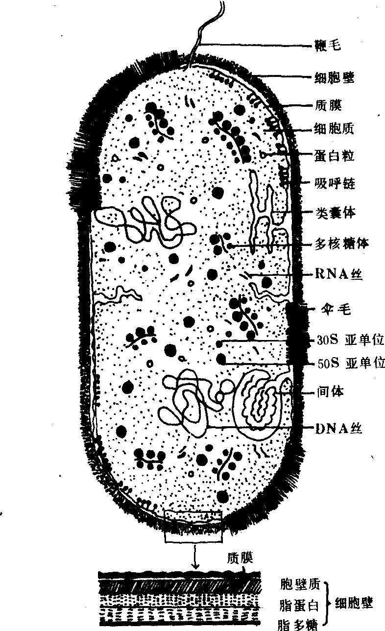 图506细菌细胞模式图 原核细胞见细胞。 原核细胞遗传物质DNA有固定的蛋白质与之结合,但不围以核膜,没有典型核结构的一类细胞。如细菌和蓝藻。 原核细胞prokaryocyte核物质与细胞质之间无核膜隔离的一类细胞。如细菌、支原体和蓝藻等。在进化上较原始,约30亿年前在地球上出现。由细胞膜、细胞质和拟核构成,拟核是一条裸露的DNA双链。细胞质中除含有核糖体和间体(近核区的细胞膜内褶)外,没有真核细胞中的各种细胞器,但许多细菌表面有鞭毛或纤毛。能进行光合作用的蓝藻和细菌具有细胞壁和内膜结构,膜上附着与光合作用有关的色素组分。 |