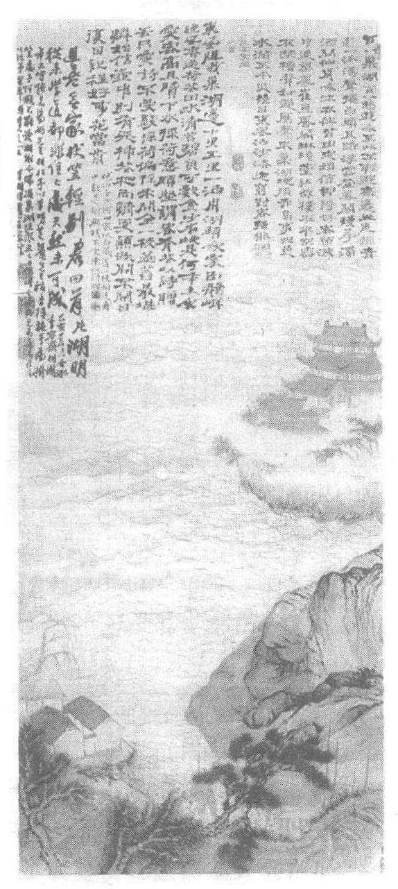 | 释义 | 原济巢湖图轴清。原济绘。纸本水墨设色。纵96.5厘米,横41.5厘米。天津市艺术博物馆藏。原济见《原济古木垂荫图轴》条目。此图描绘的是安徽巢湖的景色。作者以俯视的角度作画,构图既有纵深感,又有空间感。沧溟的湖水占据了画面的大部,波涛万顷,气势恢宏,震撼人心。湖中有雾霭笼罩的小岛,其上楼阁耸立,为绿树所绕。近处依湖岸所筑农舍错落有致,其旁古松偃仰,为画面增添生命的活力。湖湾里几只渔船静泊,人物活动其间。整个画面是一幅晚秋景色。那湖水的层层清波和摇曳不已的垂柳杂树表明阵阵秋风从湖中刮来,具有清寂冷幽的寒意,使异乡客触景生情。作者笔法老练娴熟,笔意清洁,设色以冷调为主。此画作于乙亥年,即康熙三十四年(公元1695年),是原济绘画艺术处于顶峰时期的杰作。画的上半部有题诗四首,为作品增添了文学色彩。