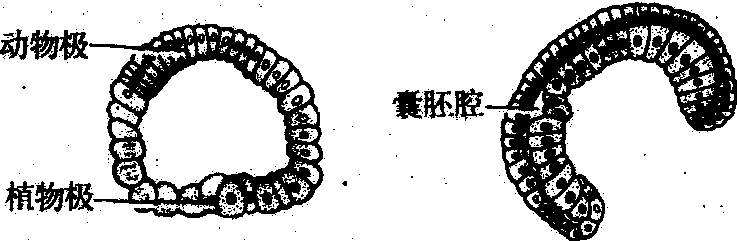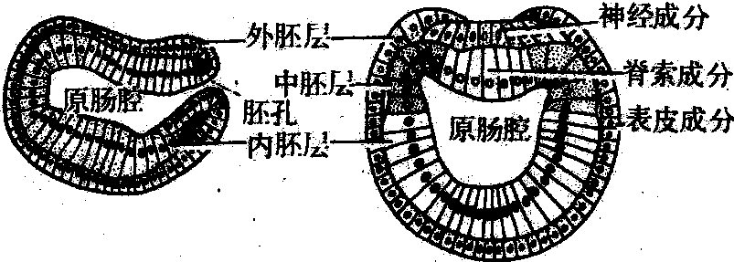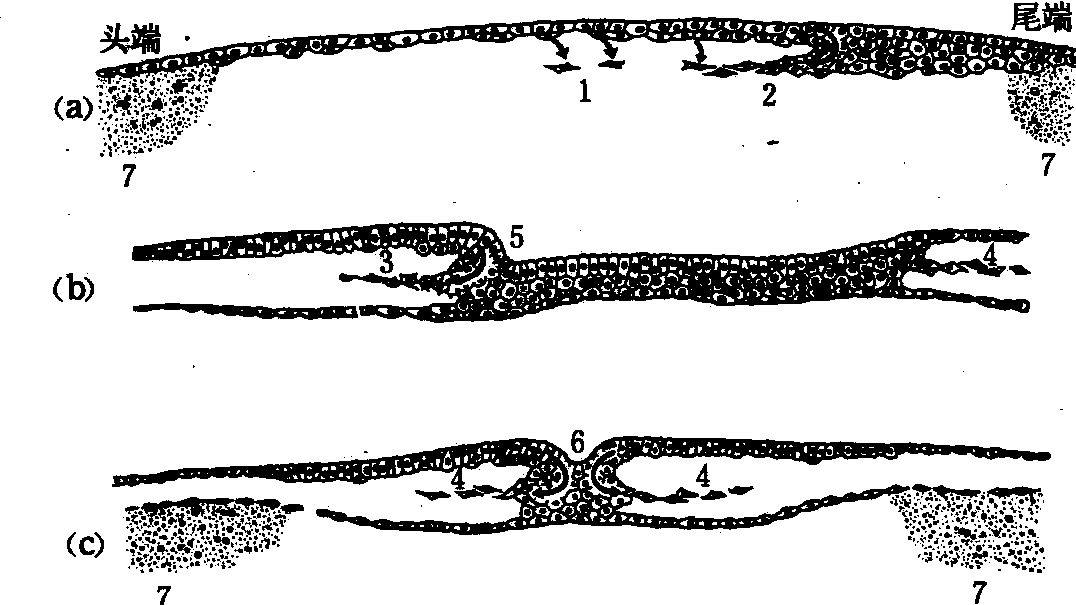 图 1 文昌鱼的原肠胚形成 蛙的原肠胚形成 开始在囊胚的赤道与植物极之间,细胞内陷而出现一条弧形横沟,沟的上方为背唇。随着背唇出现,动物极细胞向下方外包,覆盖植物极的卵黄细胞,同时,许多细胞向背唇集中卷入,形成新月形胚孔,它是原肠的开始。以后,细胞继续在背唇处集中并内卷,动物极细胞继续外包,侧唇和腹唇相继出现,胚孔由新月形变为马蹄形,最后变为环形胚孔; 挤塞在胚孔内的卵黄细胞形成卵黄栓。原肠胚形成中,脊索、背中胚层及原肠顶壁内胚层,从背唇和侧唇内卷的细胞通过分层法分化而来; 原肠底壁的内胚层则从囊胚植物半球的卵黄细胞从唇沟下缘内陷、内卷,经分化而来; 在脊索两侧的背中胚层进一步向前方、两侧和腹面伸展,分布于内、外胚层之间; 原肠腔由小变大,囊胚腔随之缩小而消失; 胚孔最后成为卵圆形或梨形的斑点。从囊胚发育为原肠胚时,胚轴旋转120°。 鸡的原肠胚形成 鸡卵含有大量卵黄,原肠作用与蛙的不同,不能形成真正开口的胚孔,其内胚层和中胚层是由原来胚盘外表面的一些原始细胞通过分层、内卷而来(图2)。受精卵从母体产出时,已发育到原肠胚早期,下胚层(或内胚层)基本形成,下胚层的上方为上胚层(或外胚层),下方有原肠腔与卵黄相隔。进一步发育,可见胚盘表面细胞向明区后部中央集中并向前伸展,形成原条及其头端的原结。随着原条和原结的出现,原结中央又下陷成原窝,原条正中也微向下陷成原沟。明区后部的细胞继续向原条集中,并从原沟内卷,由后部中央向前部外侧呈翼状展开,在上、下两胚层之间形成一层中胚层; 同时,明区前部的细胞从原窝前壁也向前方内卷形成头突,位于外胚层下方。头突继续向胚胎前、后方伸展形成脊索,原条逐渐缩短,以至消失。三胚层的原肠胚形成。