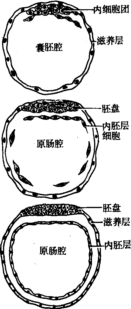 猪的原肠胚形成 猪胚发育到扩张囊胚时,透明带变薄变软,囊胚从透明带最薄弱的一端破出,称孵出。孵出囊胚呈透明泡状,叫胚泡,它在子宫中由球形迅速伸长,可长达157cm,绕成细丝圈分布在子宫角内。随着囊胚生长,内细胞团由球形变为圆盘状的胚盘,其上方滋养层逐渐消失,使胚盘暴露在外。内细胞团和滋养层下面分出零散的细胞,相连形成一层内胚层,包围的腔即原肠腔。双胚层的早期原肠胚形成(图3)。随后,暴露的胚盘通过与鸡胚相类似的发育过程,在原条和原结的基础上,外胚层细胞从原沟和原窝内卷、伸展而形成夹于内、外胚层之间的中胚层和脊索,三胚层的晚期原肠胚形成。
