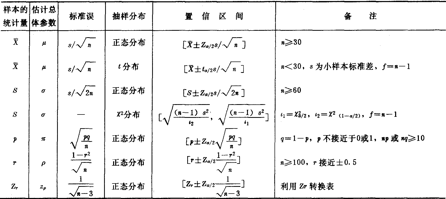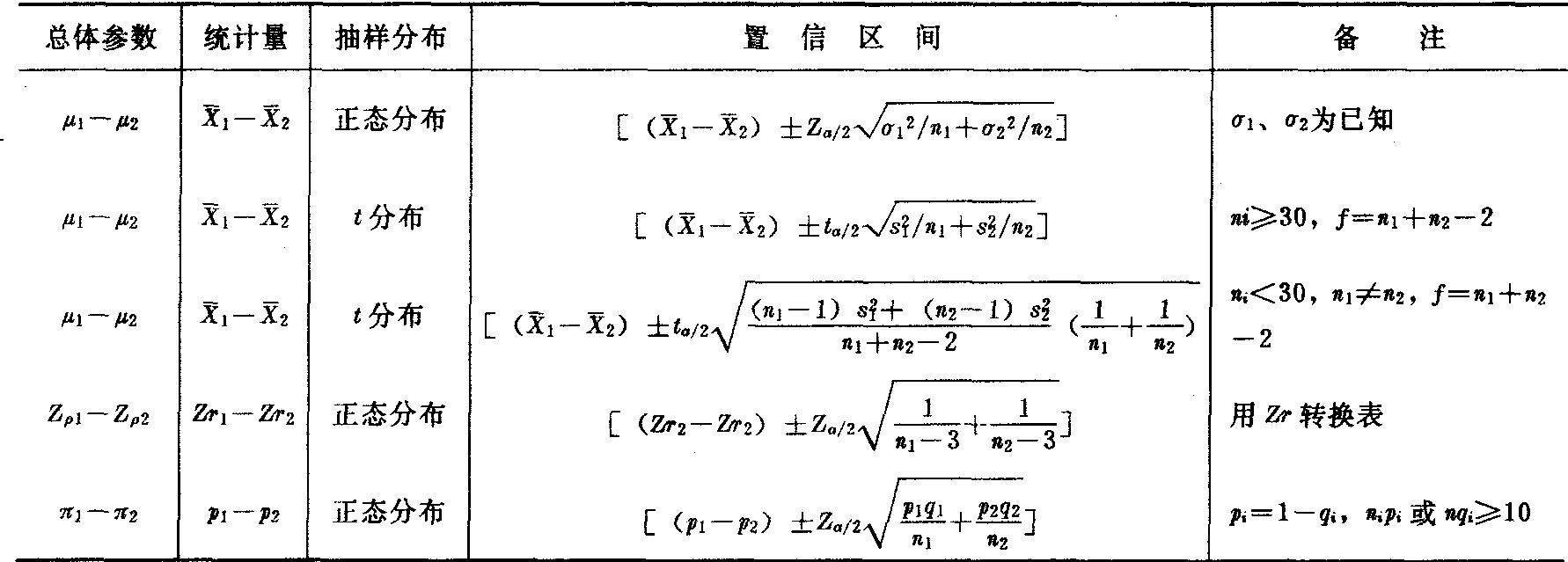 注:p为比例或百分比,r为相关系数,Zr是r对z的转换值。 [例1] 从某市初中毕业生中随机抽取1000名学生,测得他们的近视率为25%。利用表1中关于比例的置信区间公式可求得(设α=0.05)该市初中毕业生总体的近视率为: ![]() 故以95%的把握推断该市初中毕业生总体的近视率在22.3~27.7%之间。 表2 关于二个总体的主要参数估计一览表