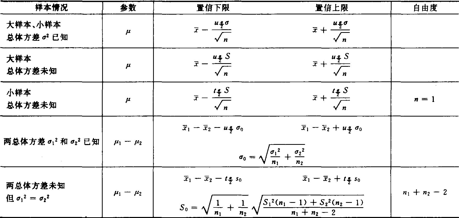 分别为μ与σ2的极大似然估计值。 可用来估计参数θ的估计量很多,因而产生了估计量的优良性问题,这种优良性的标准不是唯一的,可以根据问题的实际背景和应用方便进行选择,主要包括参数估计量的无偏性、有效性和一致性。 如果参数θ的估计量θ满足关系E(θ)=θ,则称θ是θ的无偏估计。 若θ1和θ2都是θ的无偏估计,且两者的方差比 ![]() 则称θ1比θ2有效。如果固定样本容量n,使D(θ)=极小值的无偏估计值,θ就称为θ的有效估值。 若样本容量n趋向无穷大即n→∞时,θ→θ,则称θ是θ的一致估计量。 参数的区间估计 由总体抽得的样本来估计在一定概率保证下包含总体参数θ的区间[L1、L2]的统计推断方法。保证参数θ在该区间的概率P=1-α(农化研究中α常取0.05和0.01)称为置信概率或置信度。这个区间[L1、L2]称为θ的1-α置信区间,其中L2、L1分别称为置信上限和置信下限,统称为置限。正态总体的均值μ的1-α置信上、下限列于下表,表中 ![]() 数,可查正态分布和t分布表得到(见抽样分布)。 正态总体均值μ的1-α置信上、下限表